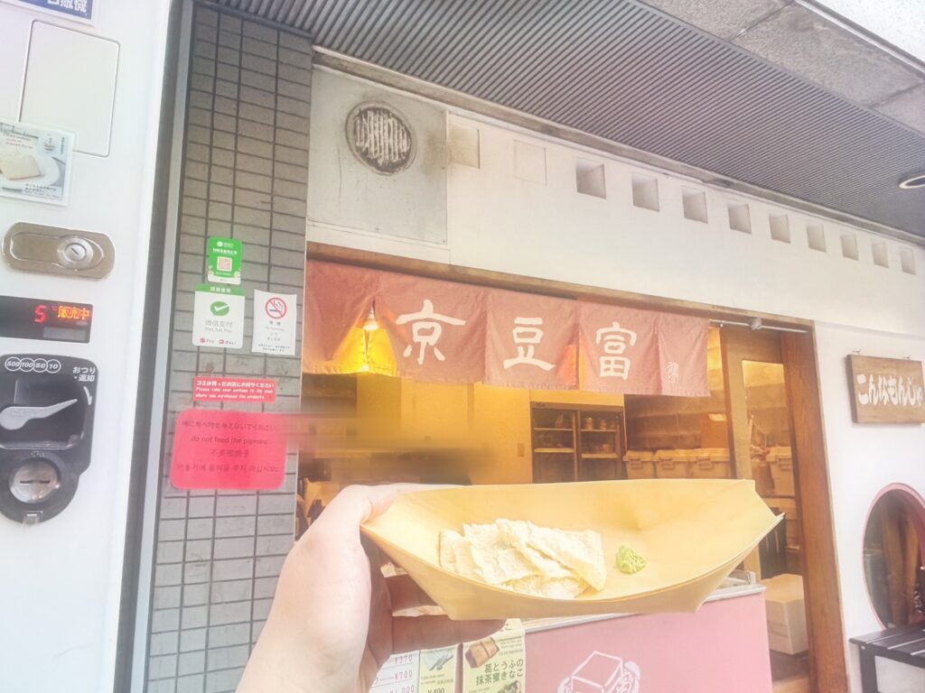 とはいえお腹がもういっぱいで食べ歩き…という気持ちでもなかったのですが、どうしても湯葉が食べたくて店先で食べられる生湯葉のお刺身。